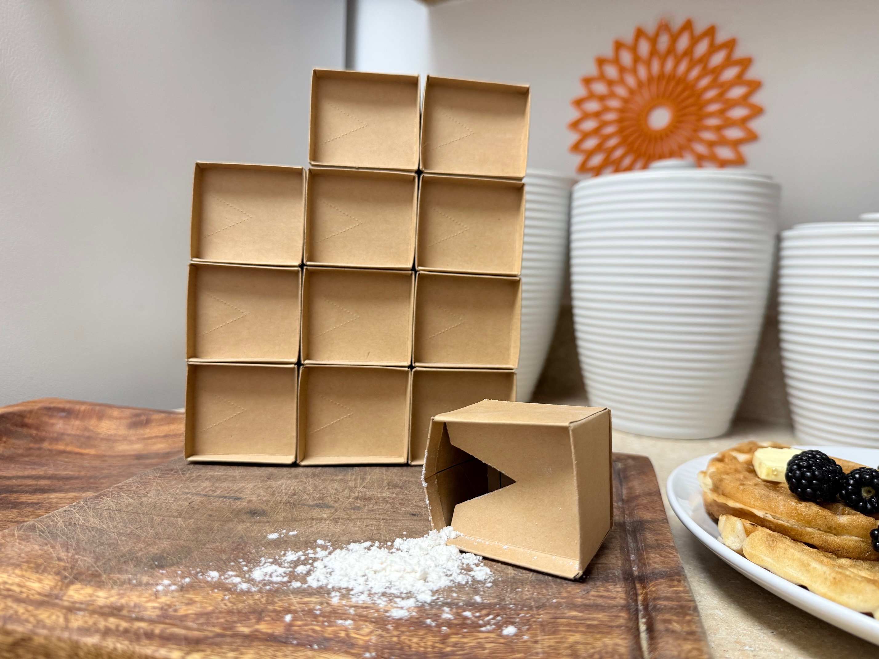Each compartment of Bite's unique waffle-shaped box is designed to be self-contained and waterproof, allowing the consumer to utilize the compartment as a measurement tool. While instructions are printed on each individual serving, nutrition information and other details are accessible on a removable sleeve.